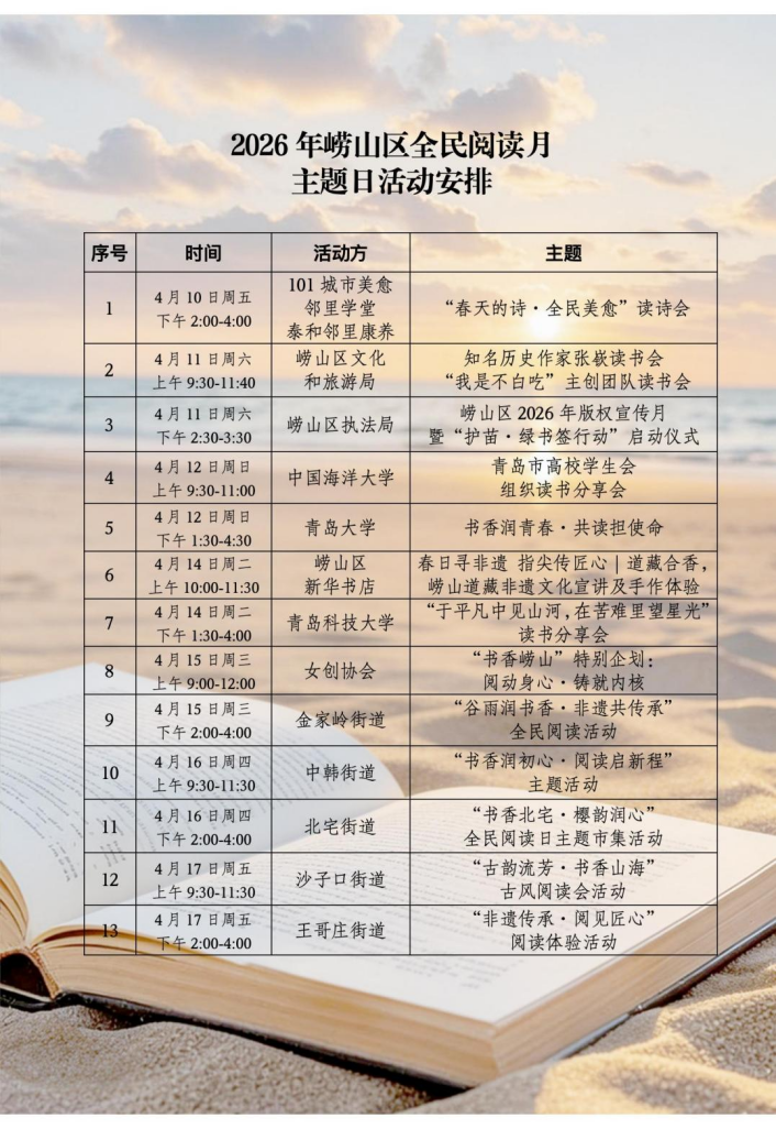 接下來,嶗山區(qū)將推出涵蓋品牌引領(lǐng)、空間提升、親子共讀等在內(nèi)的六大板塊、百余項(xiàng)精品活動(dòng),通過“月月有精品、周周有活動(dòng)、日日飄書香”的常態(tài)化機(jī)制,讓閱讀真正成為市民的生活方式,為“文化嶗山”建設(shè)注入持久的精神動(dòng)力。