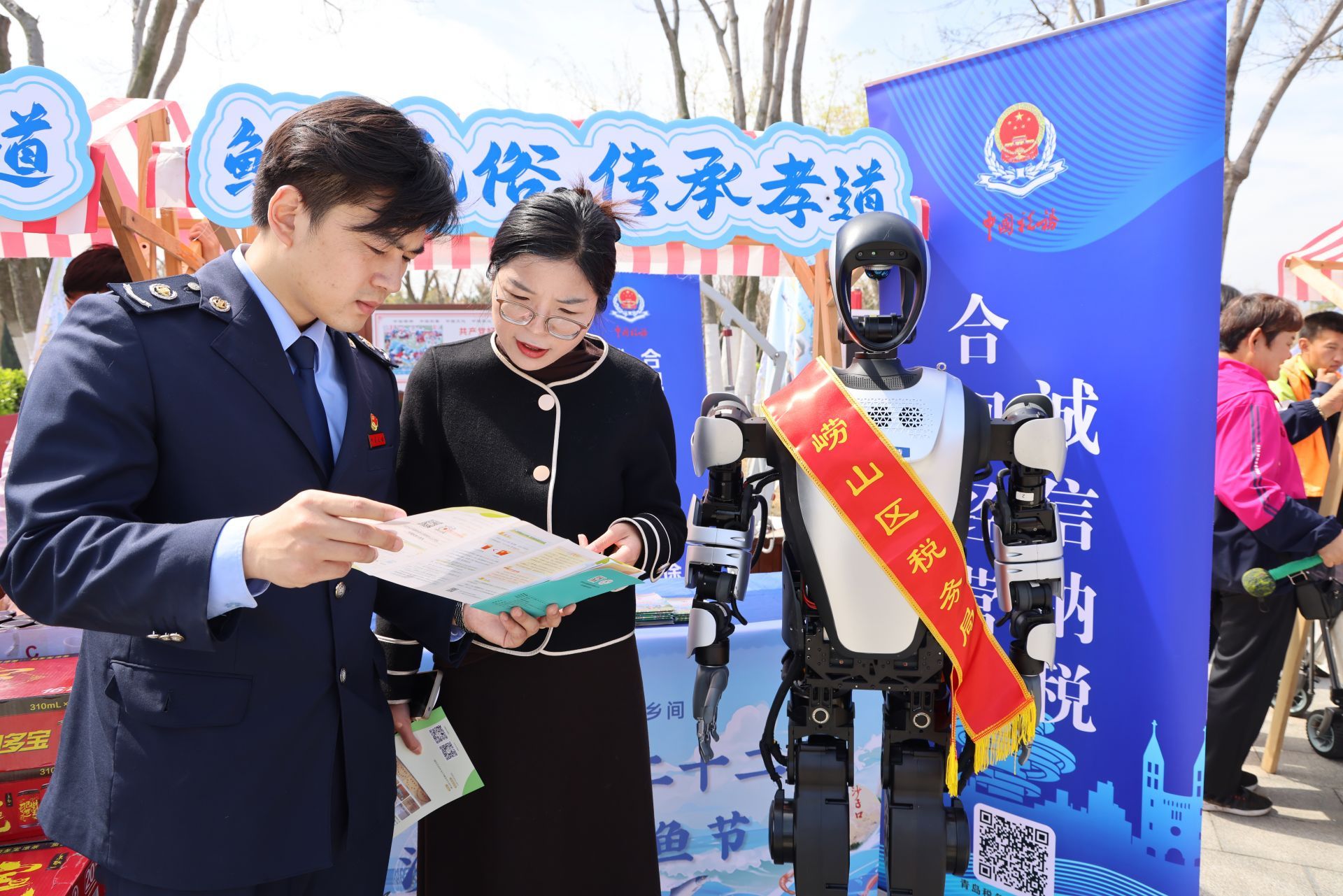 作為省級非物質(zhì)文化遺產(chǎn),沙子口鲅魚節(jié)是青島極具影響力的農(nóng)文旅融合盛會。開幕式當(dāng)天,嶗山區(qū)稅務(wù)局特設(shè)的“稅法宣傳驛站”格外醒目。與傳統(tǒng)宣傳不同,本次活動亮點紛呈——稅務(wù)機器人首次亮相稅宣現(xiàn)場,成為吸睛“明星”。