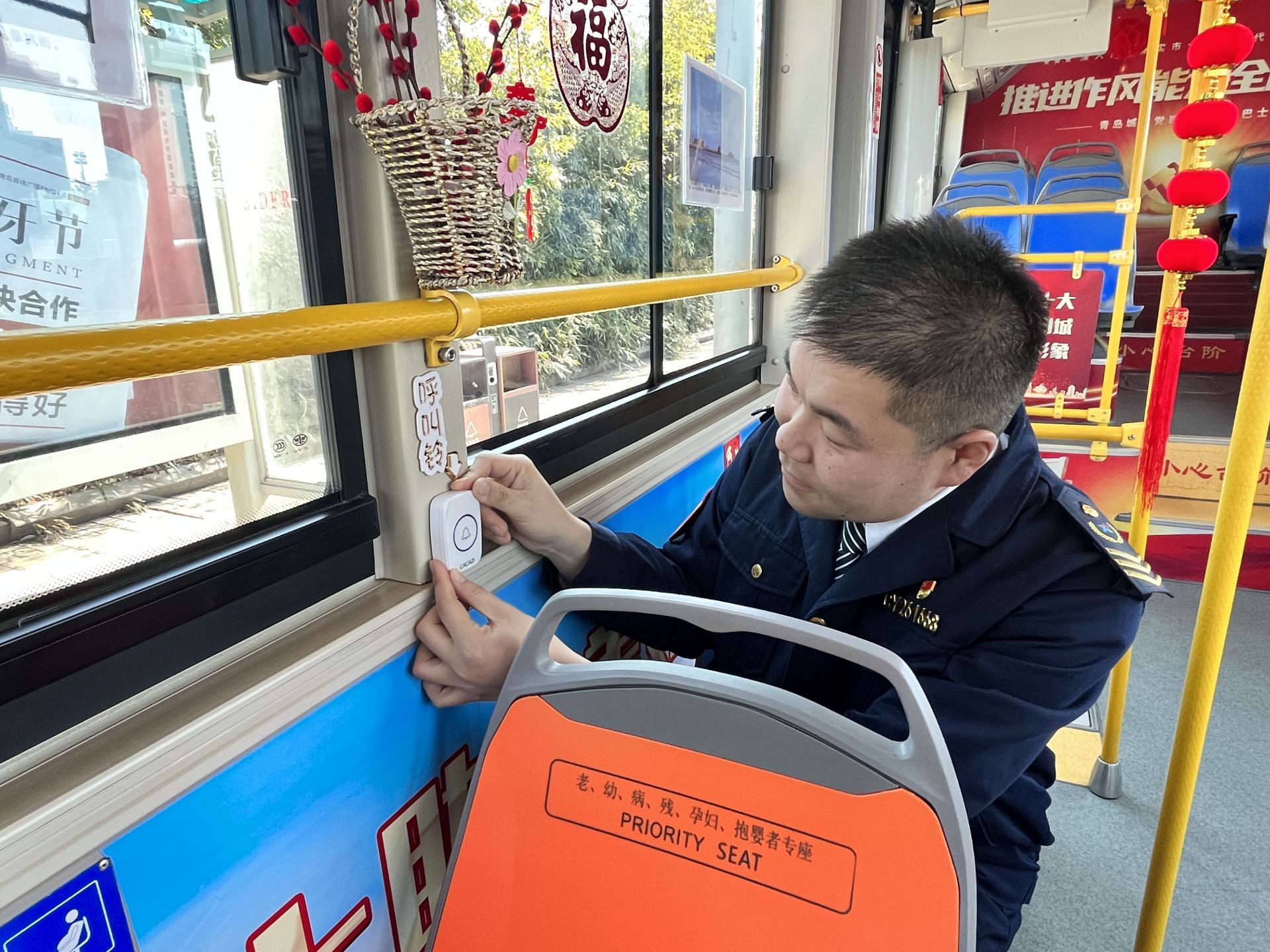 6路線駕駛員周群松在車廂內(nèi)安裝呼叫鈴。