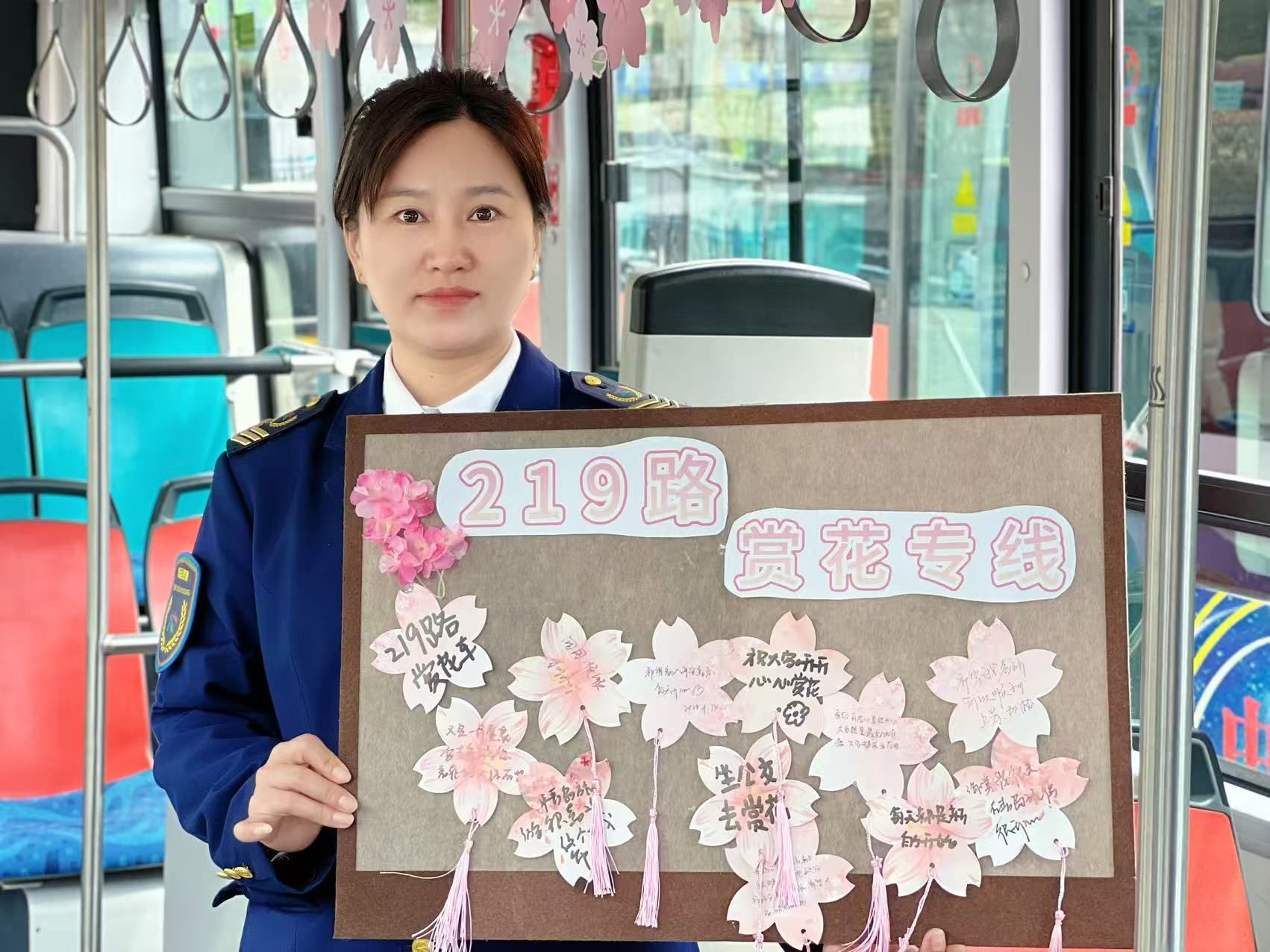 走進(jìn)219路主題車廂,一股春日氣息撲面而來。工作人員提前精心布置,將車廂打造成充滿櫻花元素的“移動花園”——車頂懸掛著一串串精致的櫻花卡片;下客門處放置了色彩鮮亮的櫻花風(fēng)車;車廂中部設(shè)置了櫻花心愿墻,張貼著空白的櫻花心愿卡,邀請乘客寫下對春天的期許與祝福,讓溫馨與美好在車廂內(nèi)傳遞。