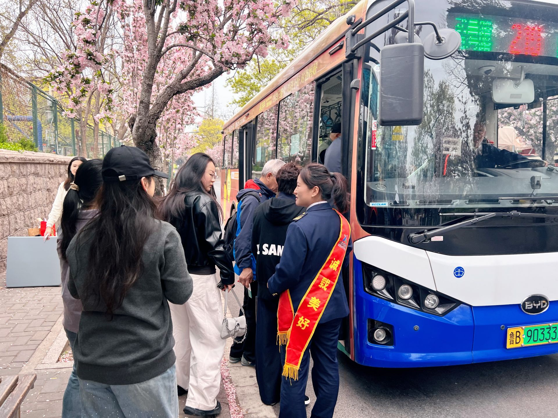 除了布置主題車廂,市北巴士第六分公司還在沿線站點(diǎn)開展志愿服務(wù)以及文創(chuàng)售賣活動。在中山公園、嘉峪關(guān)路等站點(diǎn),志愿者們主動為過往乘客提供導(dǎo)乘服務(wù),耐心解答乘車路線、賞花點(diǎn)位、發(fā)車時間等疑問,引導(dǎo)乘客有序上下車,協(xié)助特需乘客安全乘車,用暖心服務(wù)為春日賞景保駕護(hù)航。