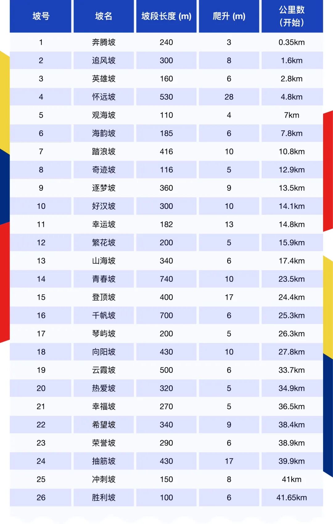 而在此之前,一張標(biāo)注著26個(gè)坡道詳情的表格早已在跑友圈中掀起波瀾——“奔騰坡”“追風(fēng)坡”“懷遠(yuǎn)坡”“抽筋坡”“勝利坡”……累計(jì)223米的爬升被拆解成26段有名有姓的起伏,最長(zhǎng)者740米,最陡處爬升28米,連最后兩公里都藏著“抽筋+沖刺+勝利”的魔鬼組合。這條被反復(fù)吟詠的“中國(guó)最美賽道”,正以一種極其硬核的姿態(tài),向所有中簽者發(fā)出挑戰(zhàn)書(shū),也向外界展露著一座城市將地理稟賦轉(zhuǎn)化為賽事IP的從容底氣。